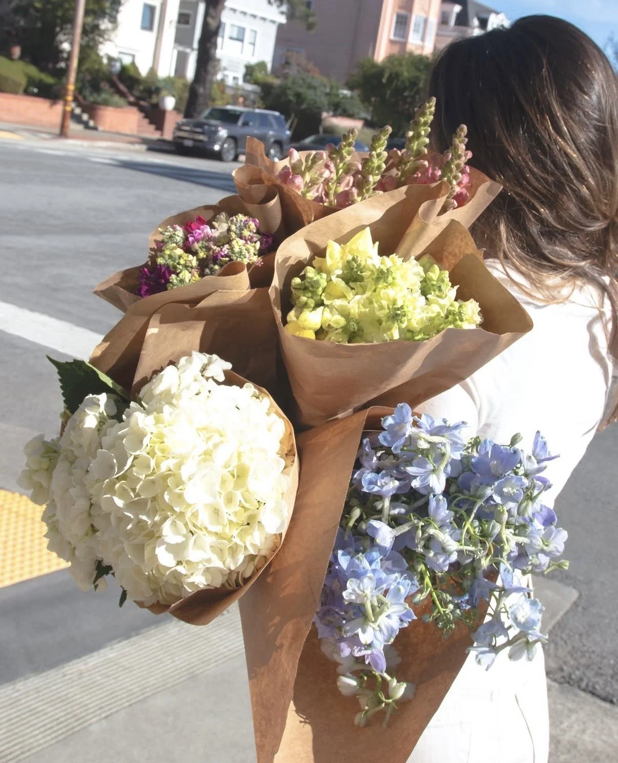 My design partner and I spent the day at the flower mart, sourcing fresh-picked florals that felt true to Dewdrop—light, dewy, just-bloomed. From there, we took the scent out into the city, capturing it as we found it: tucked into denim pockets, carried through the streets, layered into everyday moments.